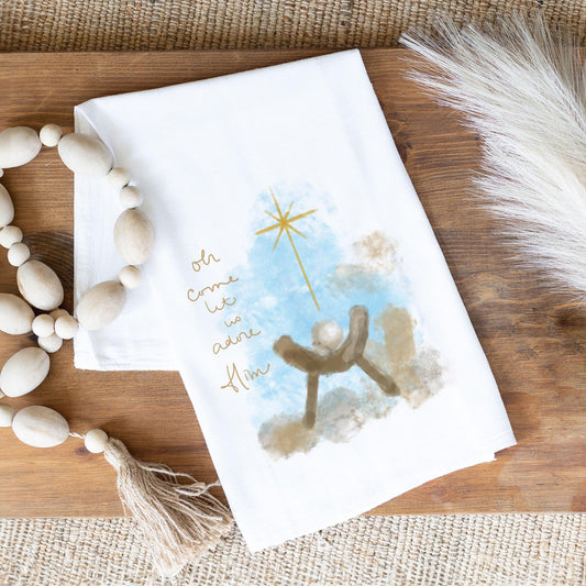 Cotton Tea Towel White-Let Us Adore Him Watercolor Manger