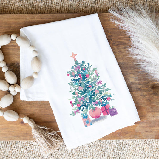 Cotton Tea Towel White-Watercolor Sugar Plum Christmas Tree