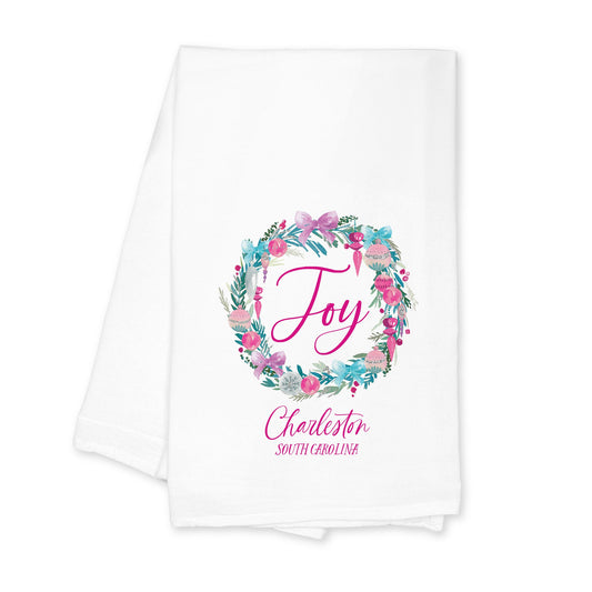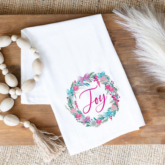 Cotton Tea Towel White-Watercolor Sugar Plum Joy Wreath