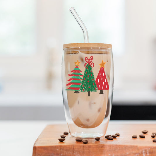 16oz Double Insulated Glass Tumbler-Whimsy Wonderland Traditional Trees
