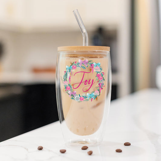 16oz Double Insulated Glass Tumbler-Watercolor Sugar Plum Joy Wreath