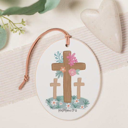 Oval Ornament-Floral Cross Matthew 28:6