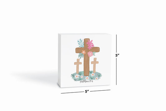 5x5 Wood Block-Floral Cross Matthew 28:6