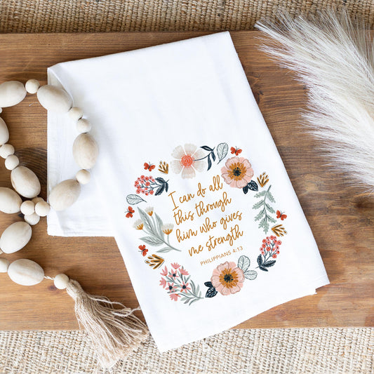 Cotton Tea Towel White-Pretty Things Floral Faith Gives Me Strength