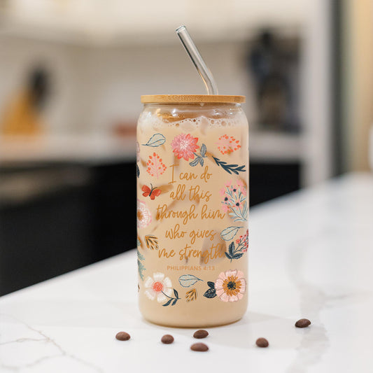 16oz Cold Brew Glass-Pretty Things Floral Faith Gives Me Strength