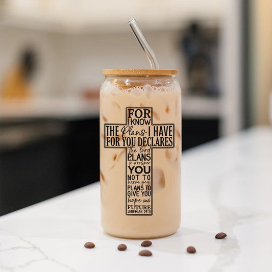 16oz Cold Brew Glass-For I Know The Plans Cross