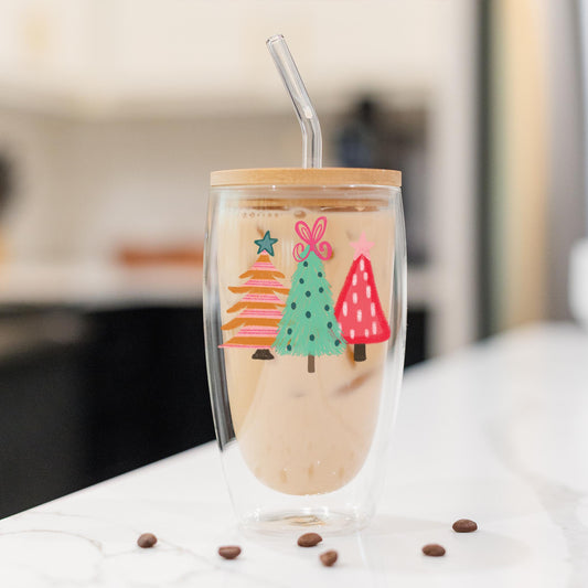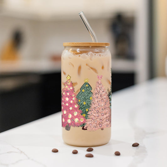 16oz Cold Brew Glass-Pink Christmas Trees