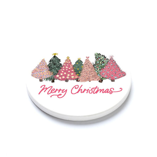 Ceramic Round Coaster-Pink Trees Merry Christmas