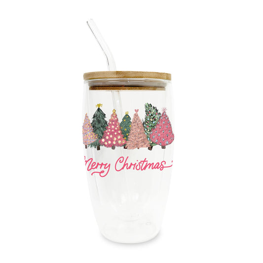 16oz Double Insulated Glass Tumbler-Pink Trees Merry Christmas
