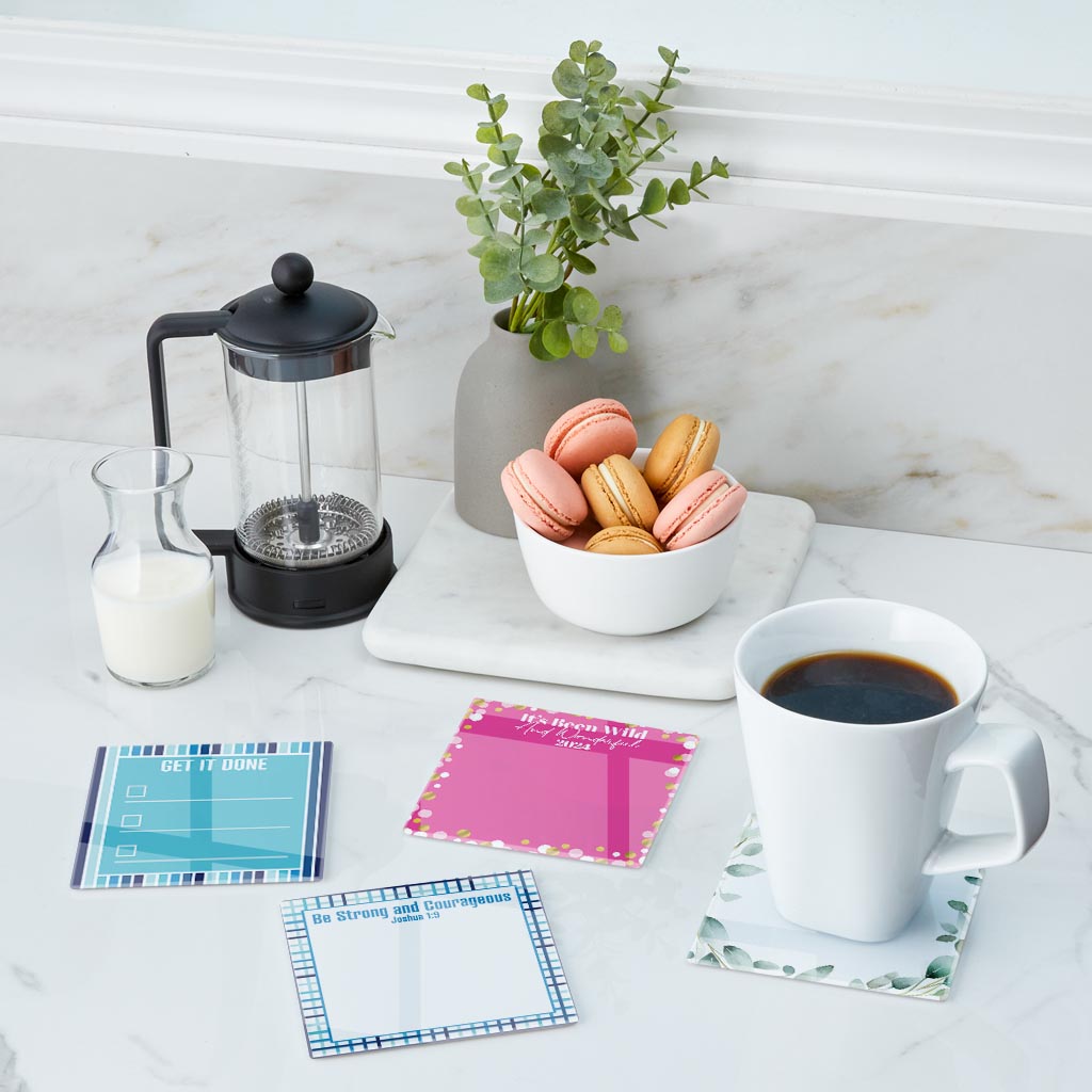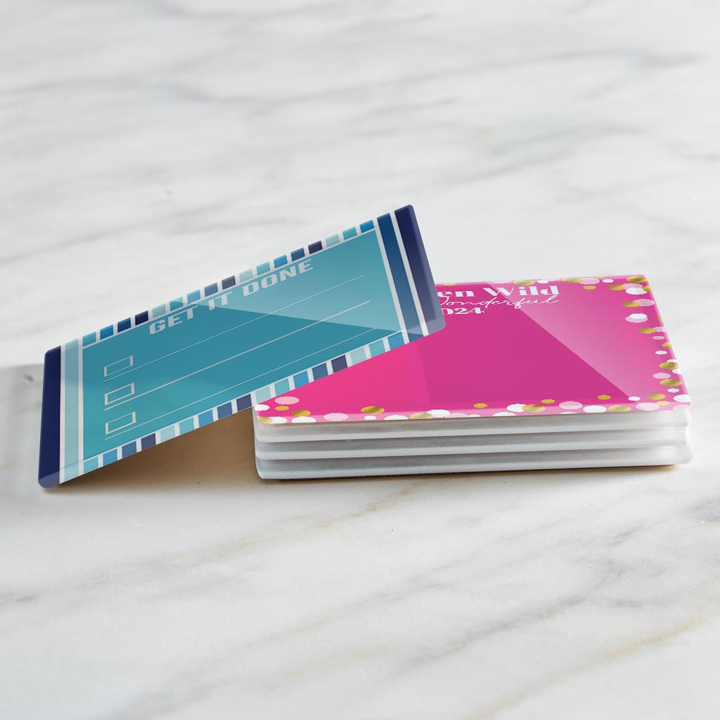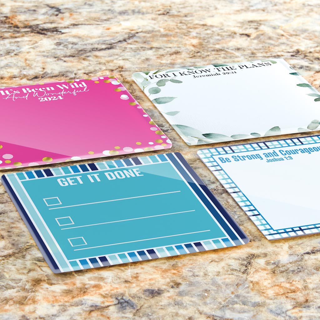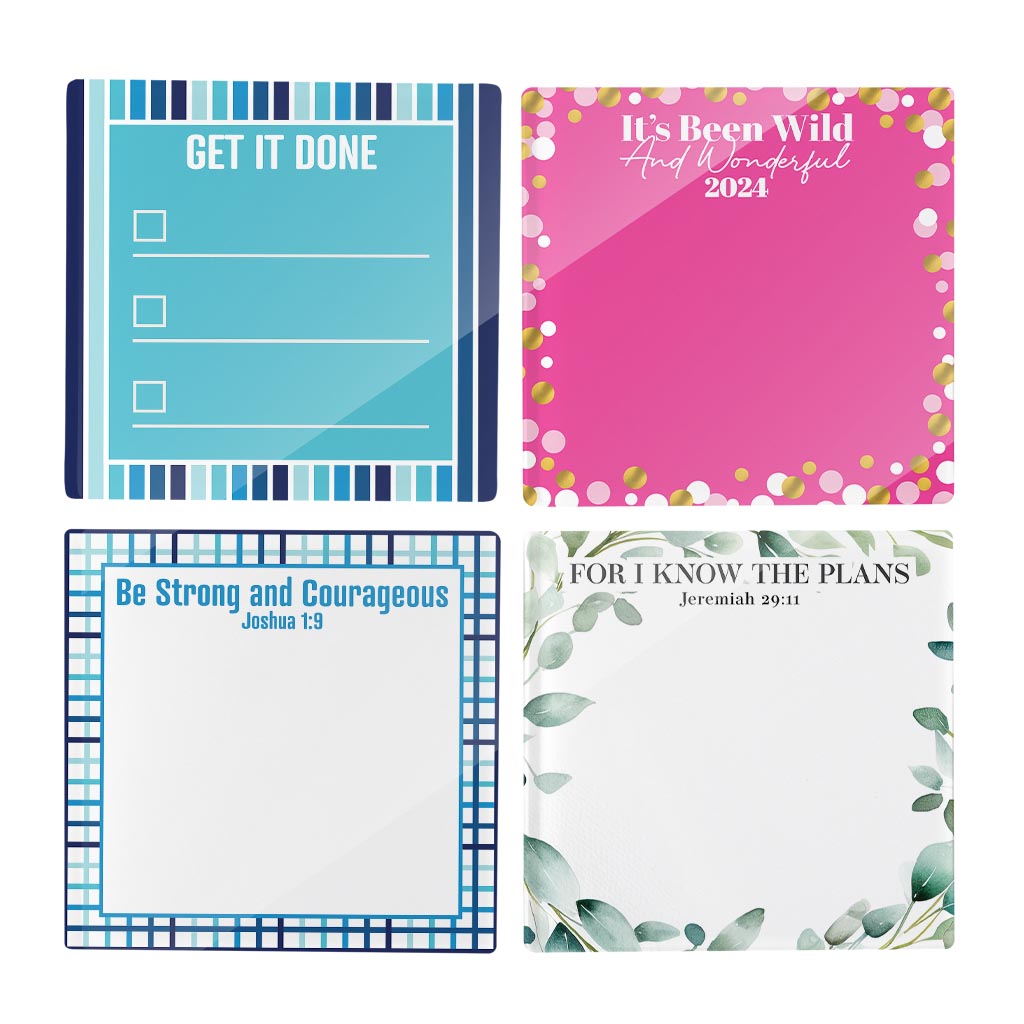 Handy and artsy! Clear Reminders are small, dry erase glass tiles, which are perfect to jot down a note or two on! Vibrant and beautiful,they’re easy to wipe clean and provide a little pop of fun décor to switch in and out. Use with any dry erase marker. It’s a win/win when art meets practicality and makes for a great gift!