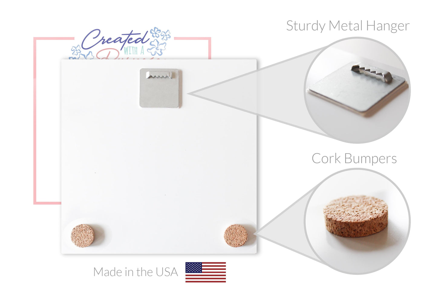 Beautiful and vibrant glass, dry erase. Use with any dry erase marker. Easy to mount on sawtooth hangers. Cork bumpers on the back protect the wall surface, provide stability while using the product, and give a modern levitating effect. Eco-friendly, water-based ink provides beautiful color and rich dimension. The high-quality tempered glass is sleek, modern, and durable. Protective, efficient packaging includes 100% recyclable cardboard.ย Proudly printed, packaged, and shipped from the USA.ย