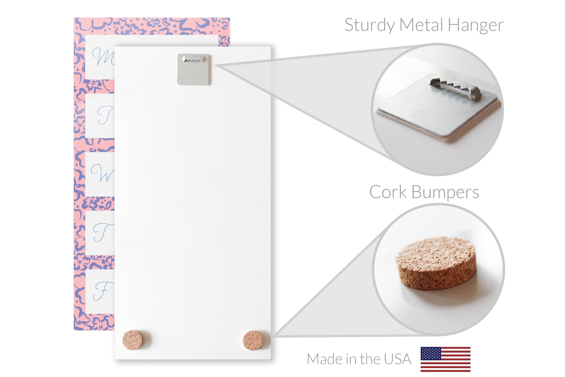 Beautiful and vibrant glass, dry erase. Use with any dry erase marker. Easy to mount on sawtooth hangers. Cork bumpers on the back protect the wall surface, provide stability while using the product, and give a modern levitating effect. Eco-friendly, water-based ink provides beautiful color and rich dimension. The high-quality tempered glass is sleek, modern, and durable. Protective, efficient packaging includes 100% recyclable cardboard.ย Proudly printed, packaged, and shipped from the USA.ย