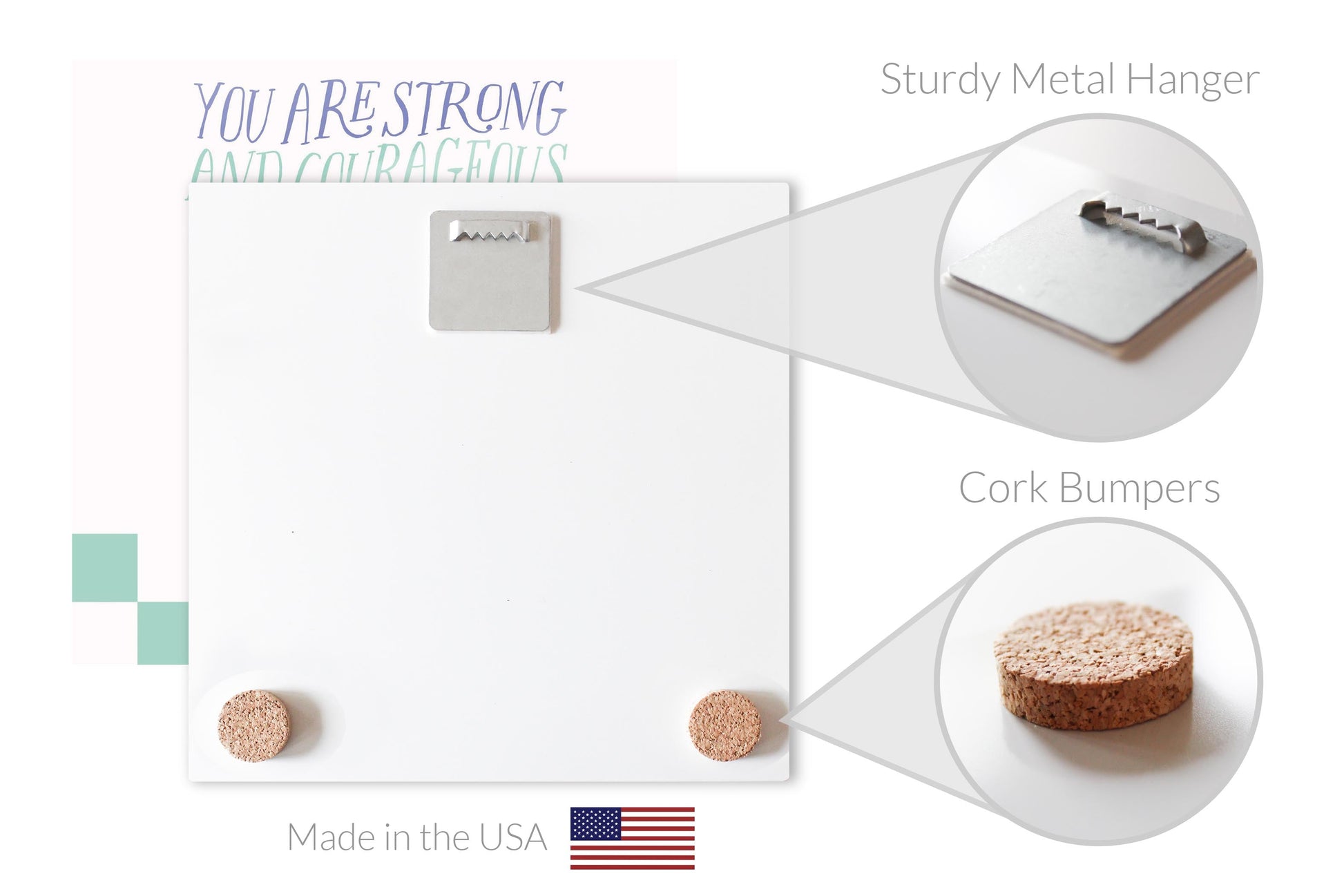 Beautiful and vibrant glass, dry erase. Use with any dry erase marker. Easy to mount on sawtooth hangers. Cork bumpers on the back protect the wall surface, provide stability while using the product, and give a modern levitating effect. Eco-friendly, water-based ink provides beautiful color and rich dimension. The high-quality tempered glass is sleek, modern, and durable. Protective, efficient packaging includes 100% recyclable cardboard.ย Proudly printed, packaged, and shipped from the USA.ย
