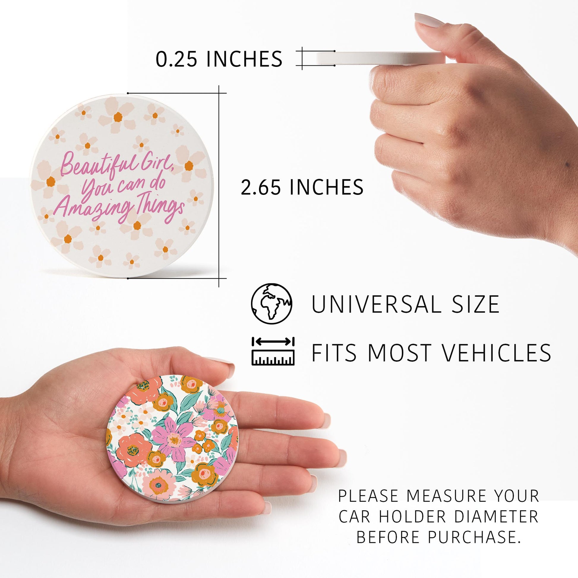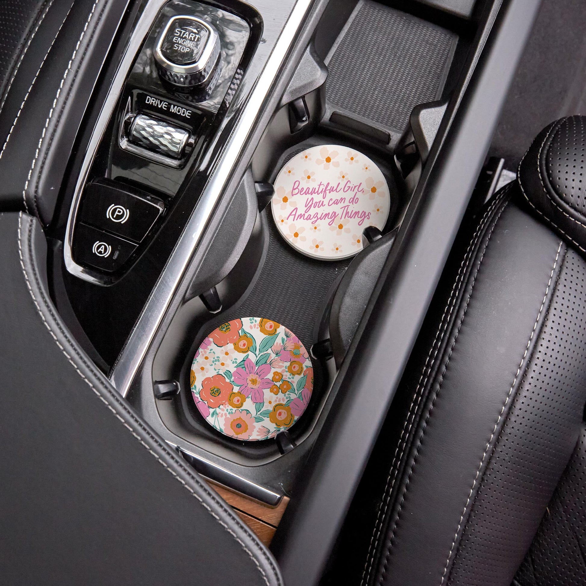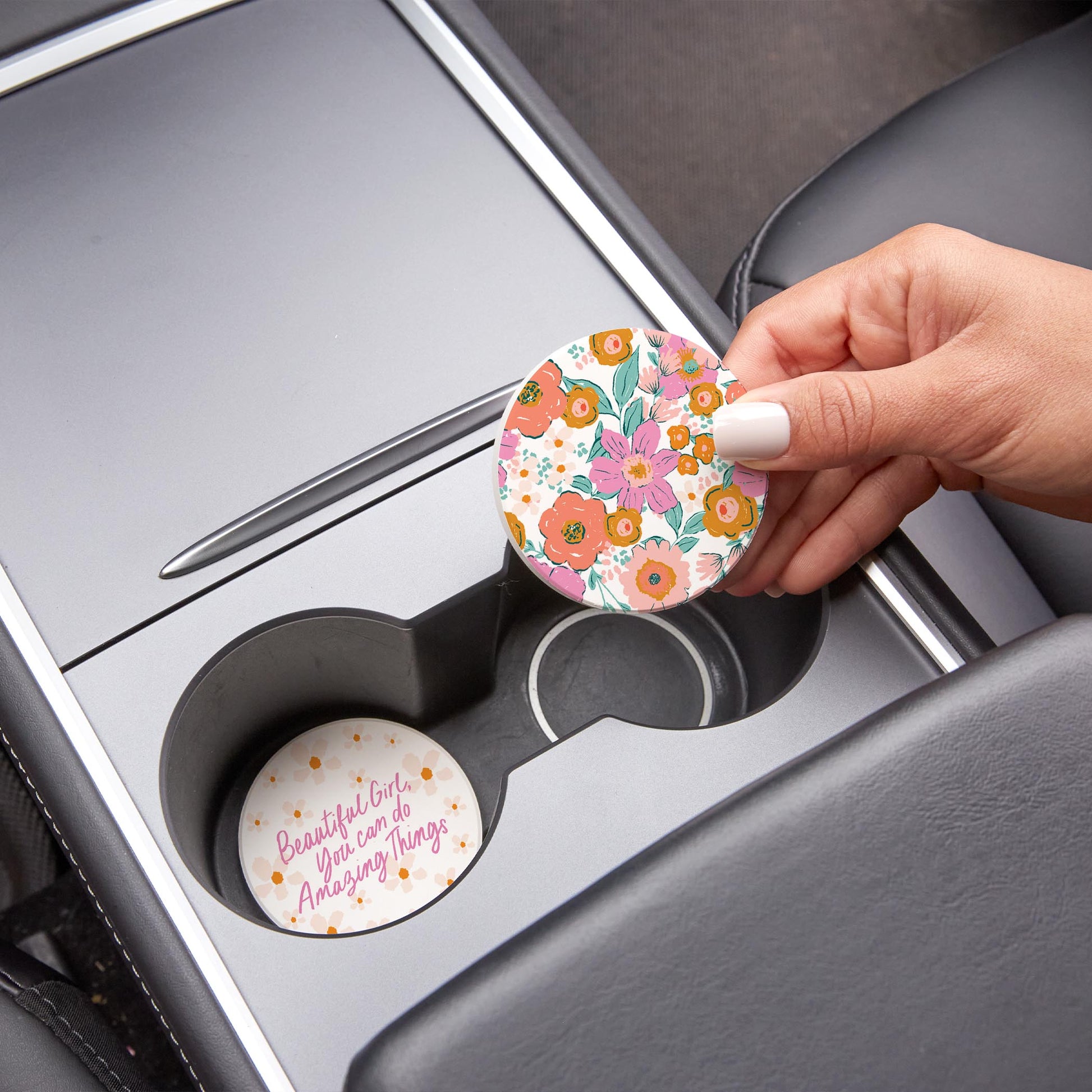 If you don’t know about car coasters yet…they’re a big deal. Like hair in the 80’s. You might ask yourself, “where have these been all my life?” Car coasters fit snuggly into your vehicle’s cup holders. Strategic divot on one side so they can be easily popped out. Pretty & practical – a pop of design and they keep your cup holders clean. 2.65” diameter. Absorbent ceramic coaster. Designed, printed and packaged in the USA