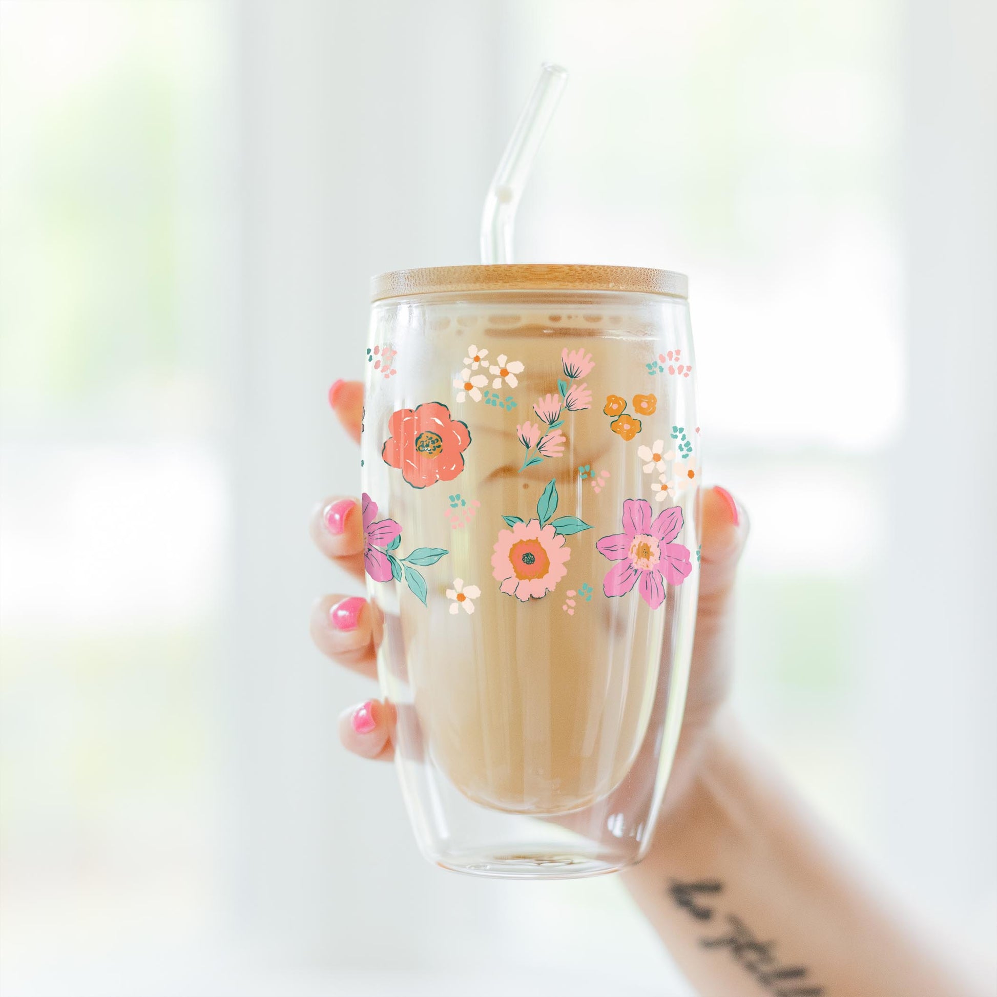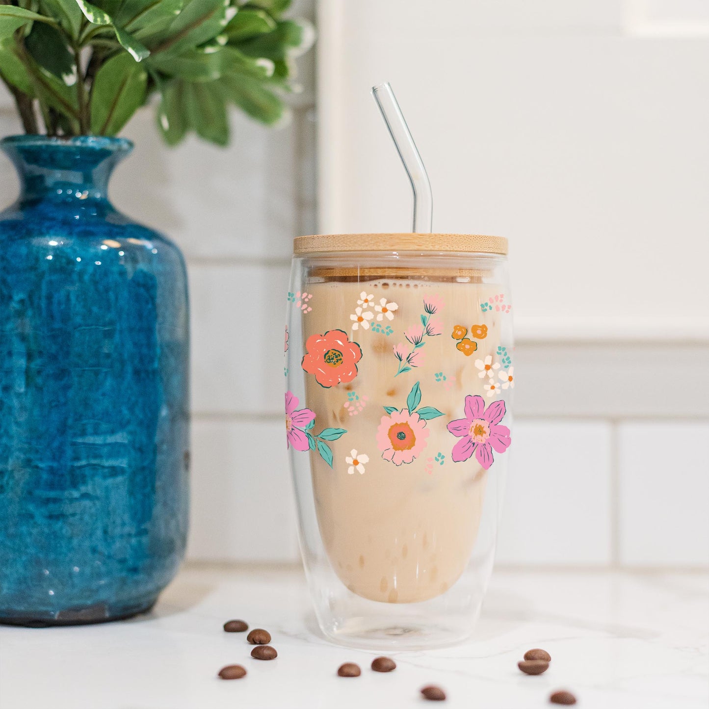 Elevate your favorite chilled beverage with our 16oz Insulated Glass Cup. These Glass Cups come with a glass straw and bamboo lid. It's perfectly sized to hold your favorite cold brew, smoothie, cocktail, or refresher. These glass cups are insulated and will hold ice anywhere from 3-4 hours, and the insulation keeps the glass from sweating.