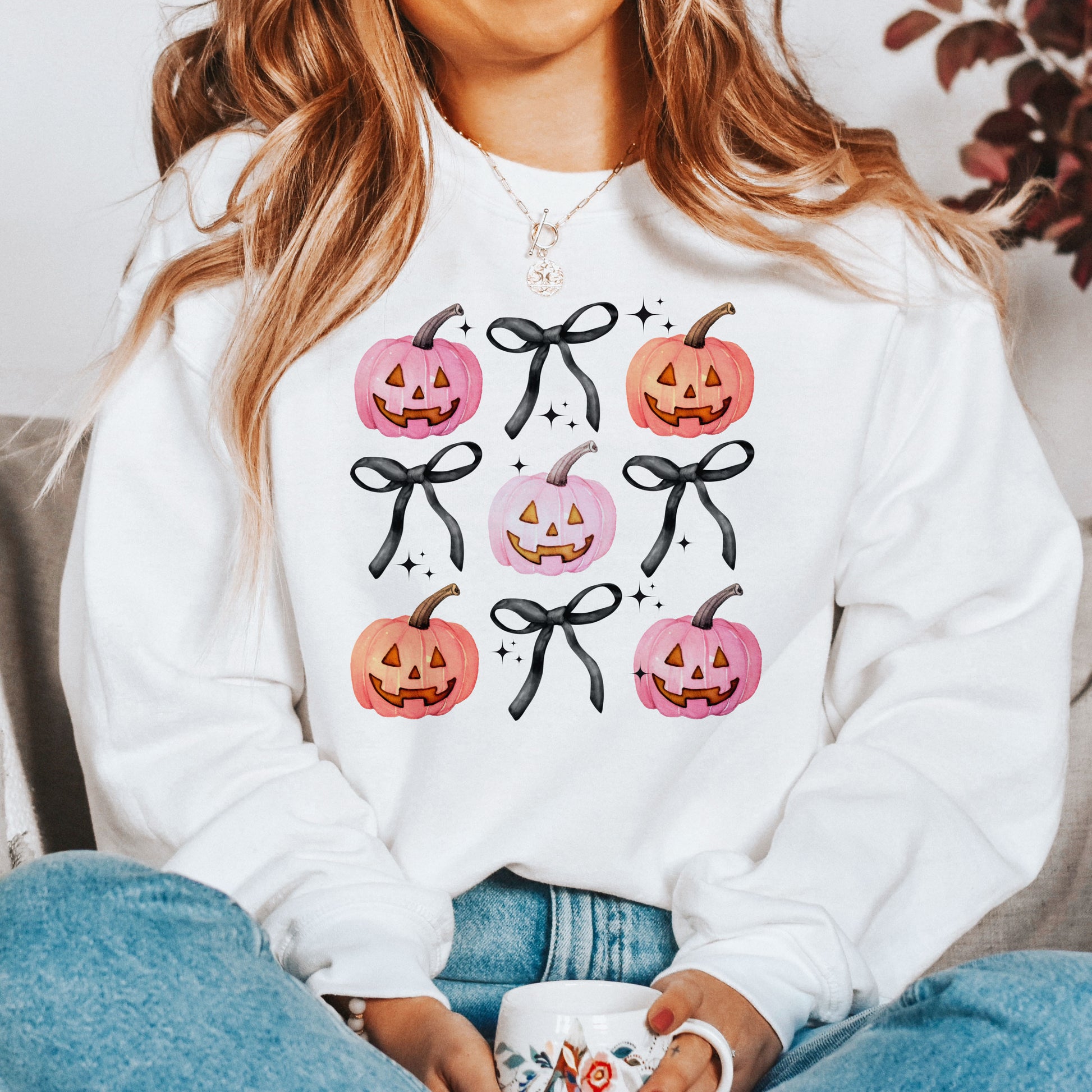 Sweatshirt White-Halloween Pumpkins and Bows