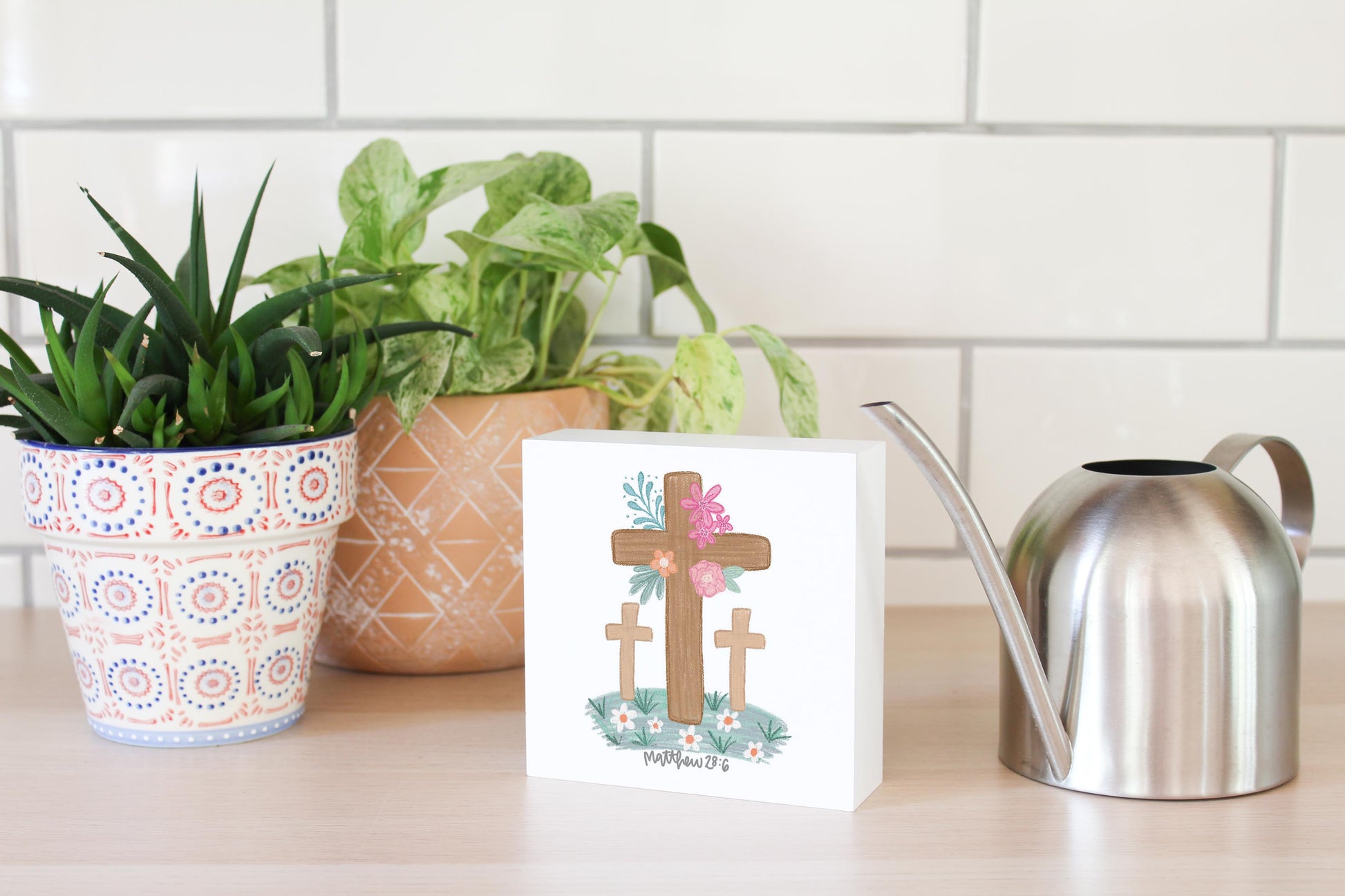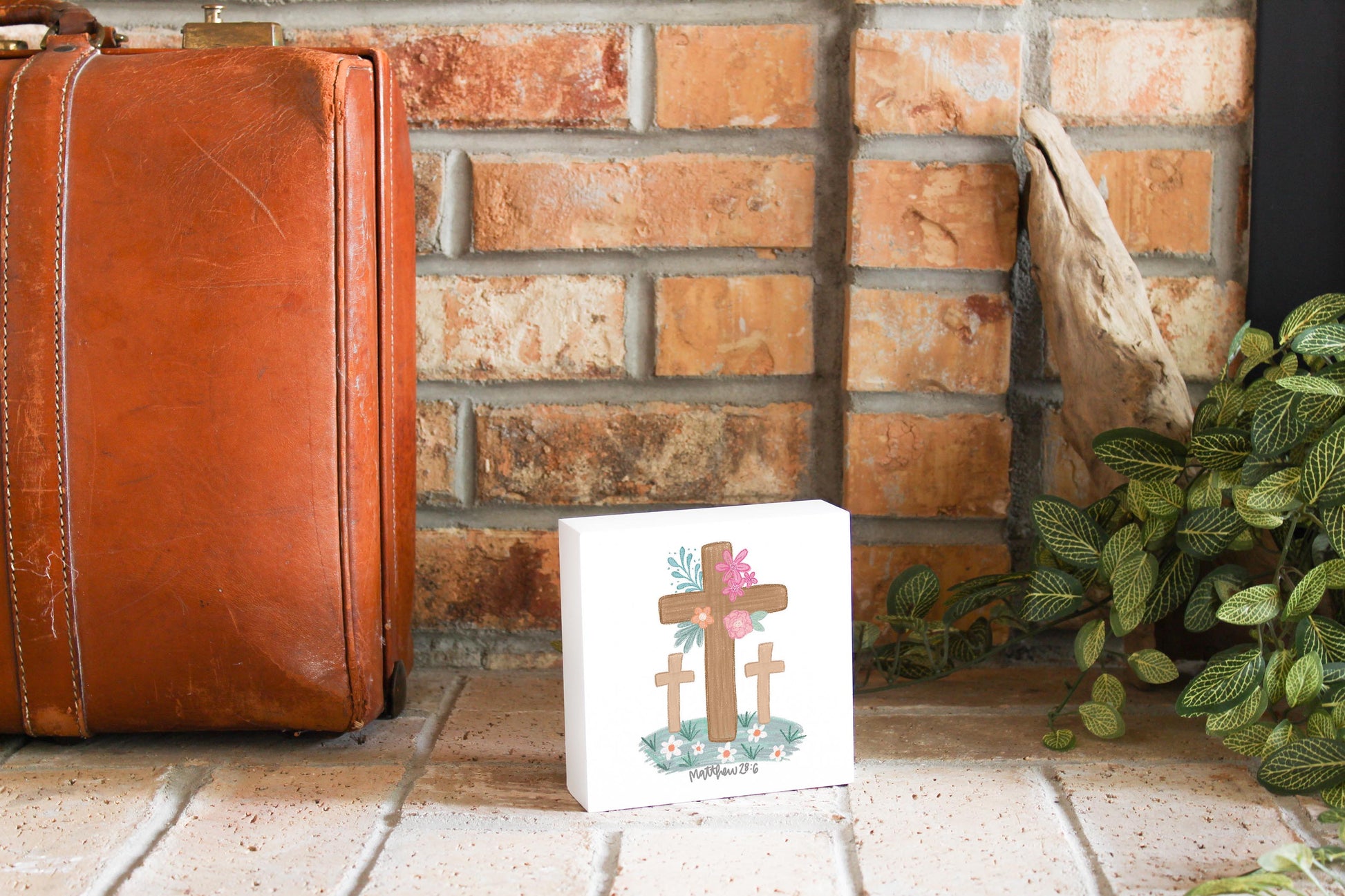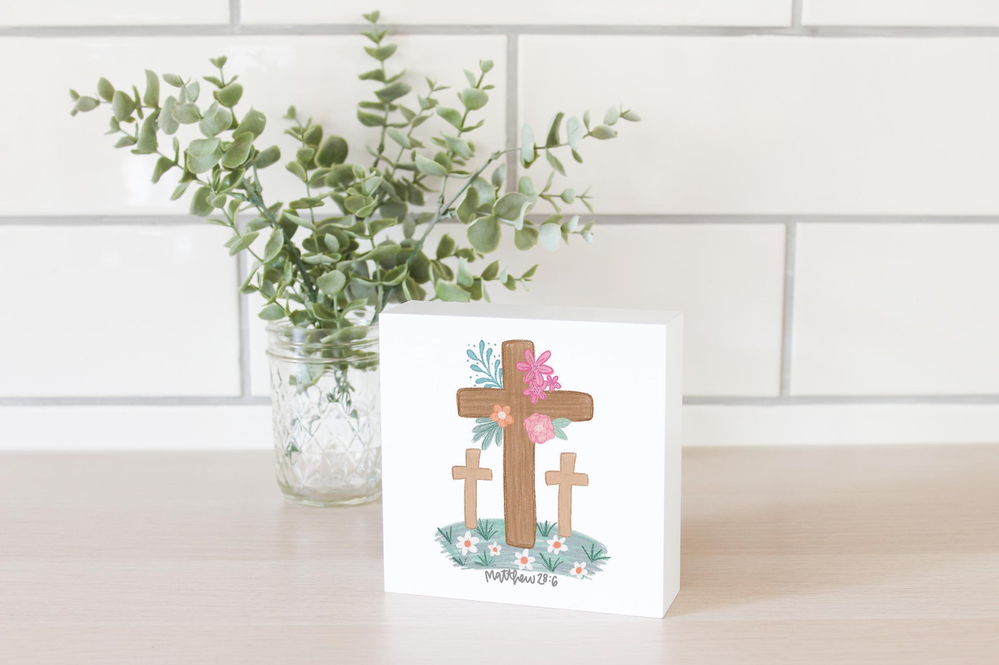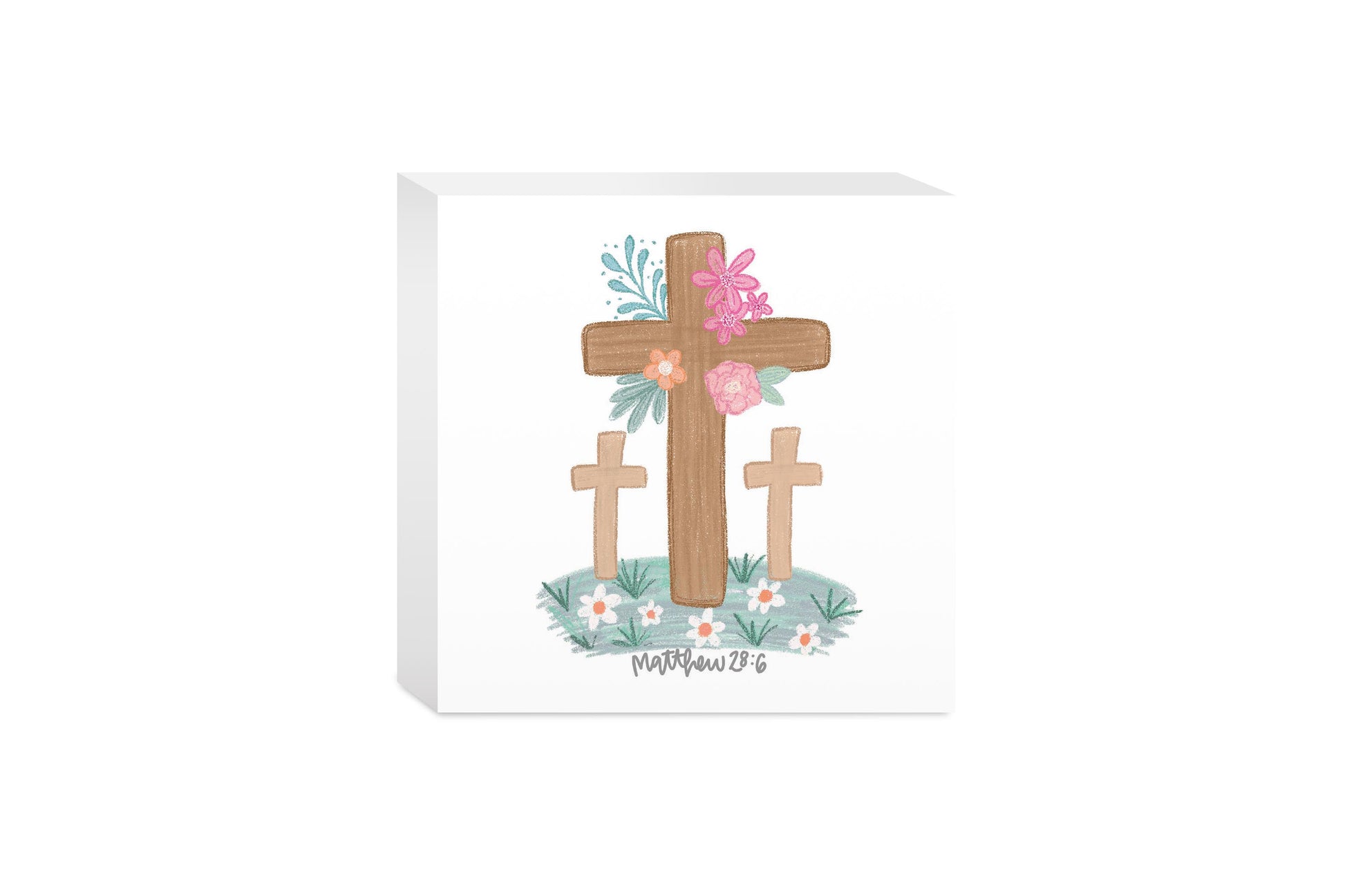5x5 Wood Block-Floral Cross Matthew 28:6