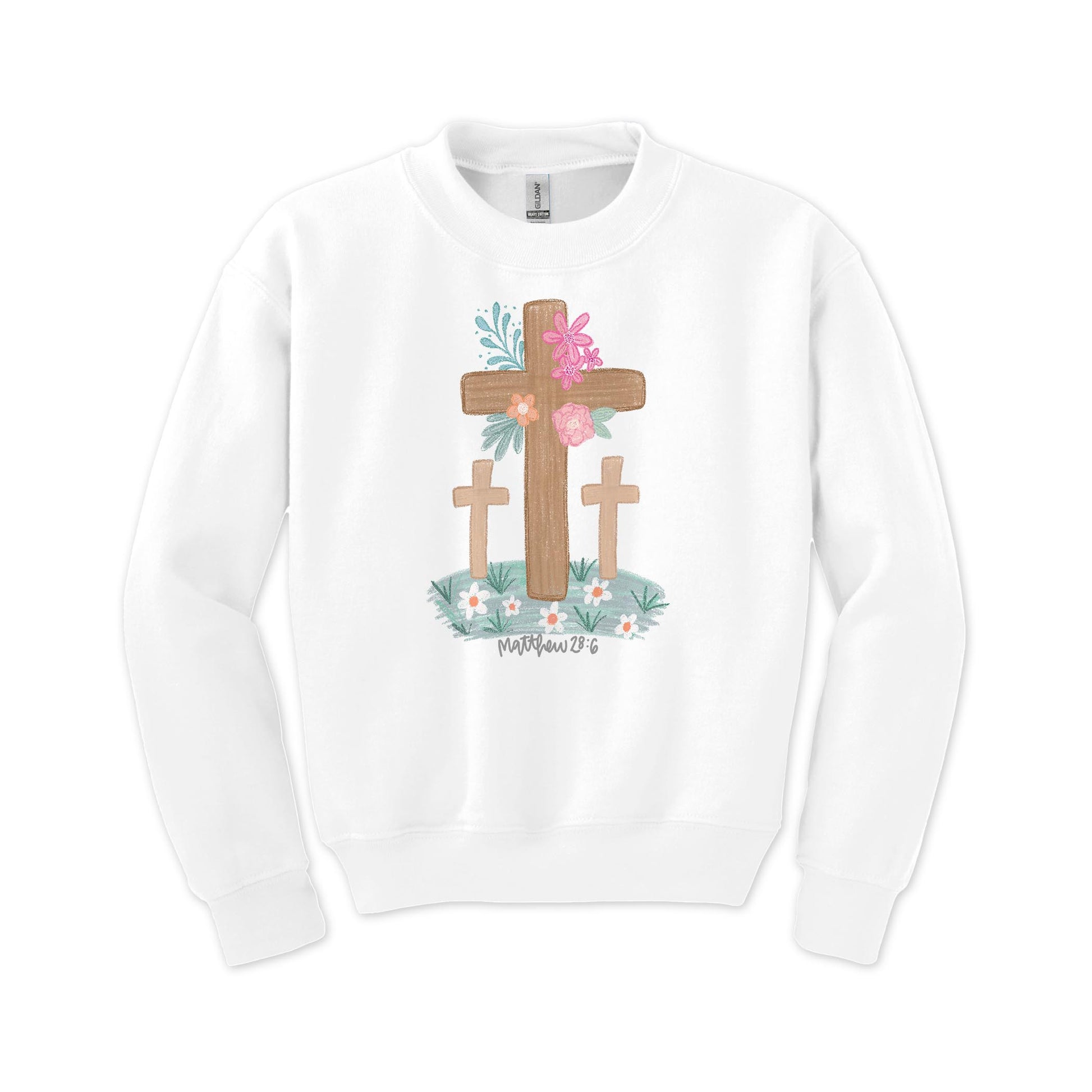Gildan Youth Crewneck White-Floral Cross Matthew 28:6
