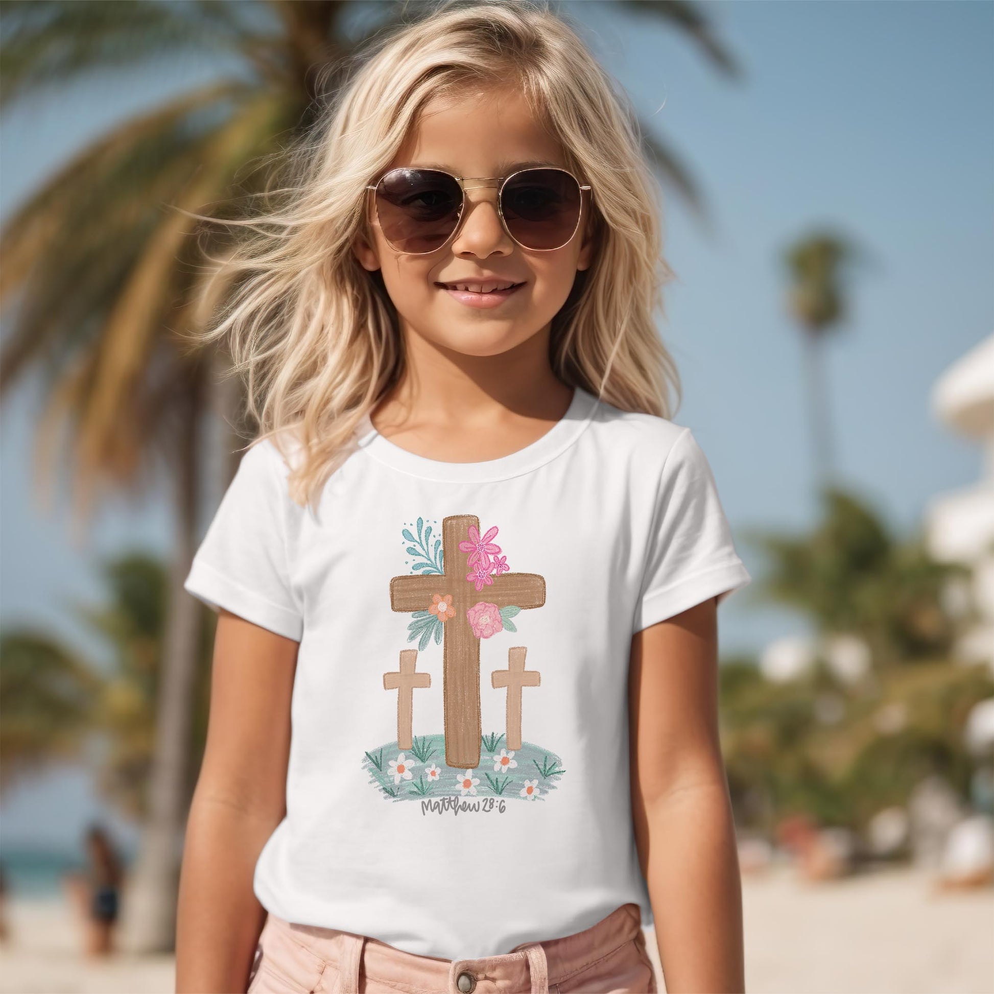Bella Canvas Youth T-Shirt White-Floral Cross Matthew 28:6