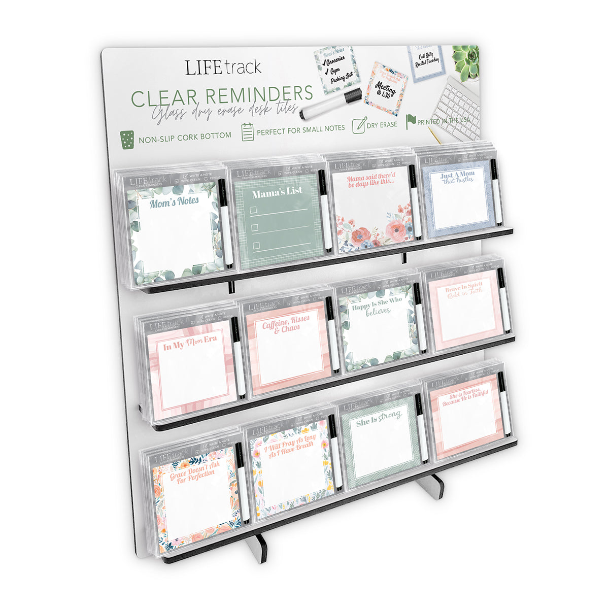 Wood display included. 96 Total - 8 of each design, 12 designs. Clear Reminders are small, dry erase glass tiles, which are perfect to jot down a note or two on! Vibrant and beautiful,they’re easy to wipe clean and provide a little pop of fun décor to switch in and out. Use with any dry erase marker. It’s a win/win when art meets practicality and makes for a great gift!