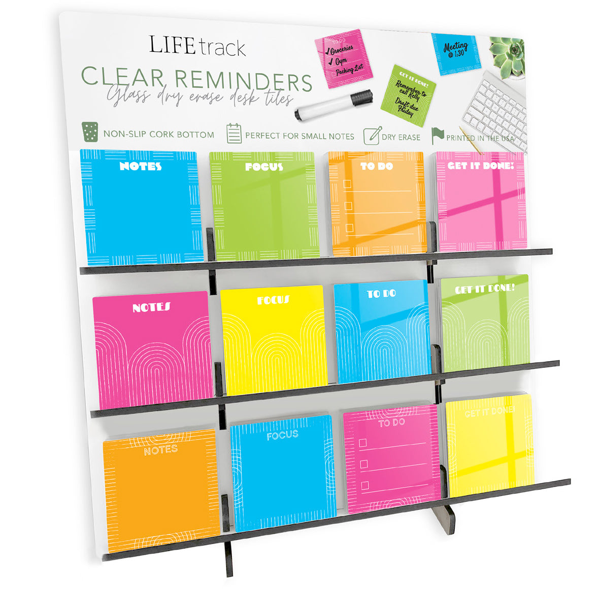 Wood display included. 96 Total - 8 of each design, 12 designs. Clear Reminders are small, dry erase glass tiles, which are perfect to jot down a note or two on! Vibrant and beautiful,they’re easy to wipe clean and provide a little pop of fun décor to switch in and out. Use with any dry erase marker. It’s a win/win when art meets practicality and makes for a great gift!
