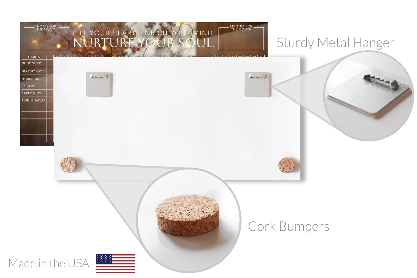 Change your life with our LIFEtrack habit trackers. Beautiful and vibrant glass, dry erase. Use with any dry erase marker. Easy to mount on sawtooth hangers. Cork bumpers on the back protect the wall surface, provide stability while using the product, and give a modern levitating effect. Eco-friendly, water-based ink provides beautiful color and rich dimension. The high-quality tempered glass is sleek, modern, and durable. Protective, efficient packaging includes 100% recyclable cardboard. Proudly printed, packaged, and shipped from the USA.