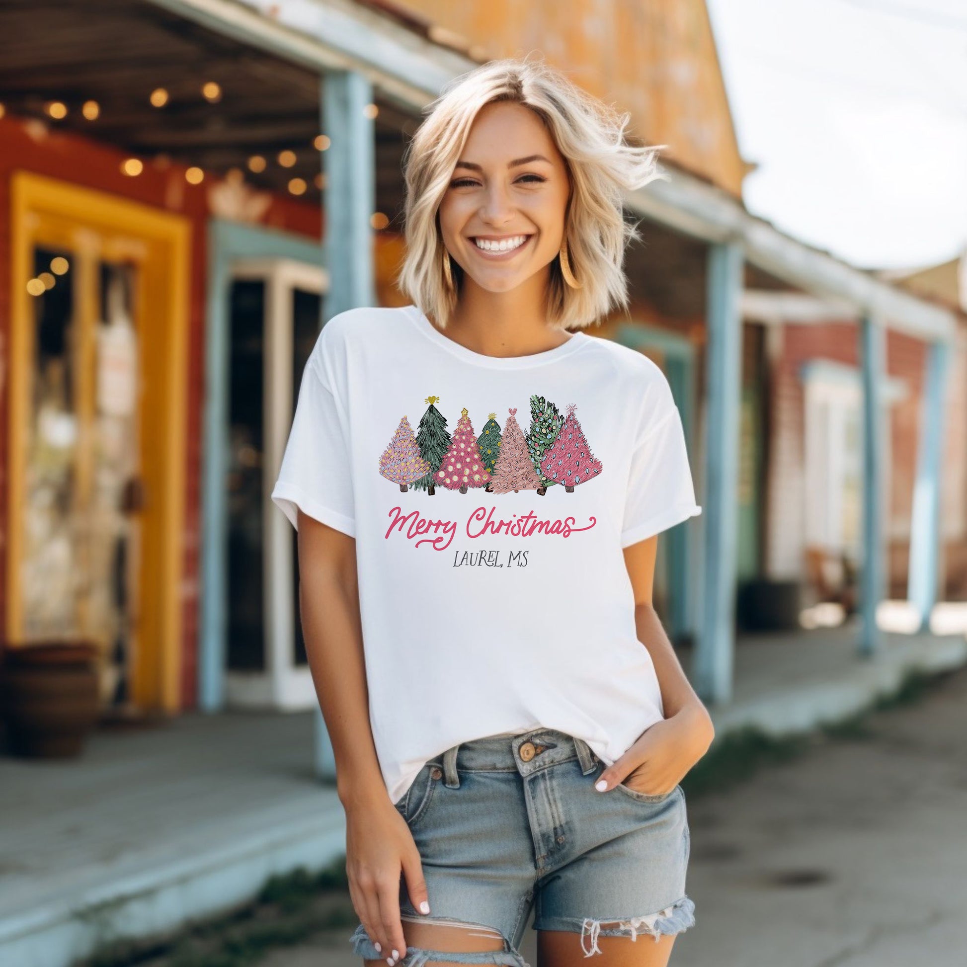 Love+Local Graphic T-Shirt | Pink Christmas Trees